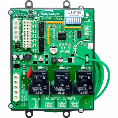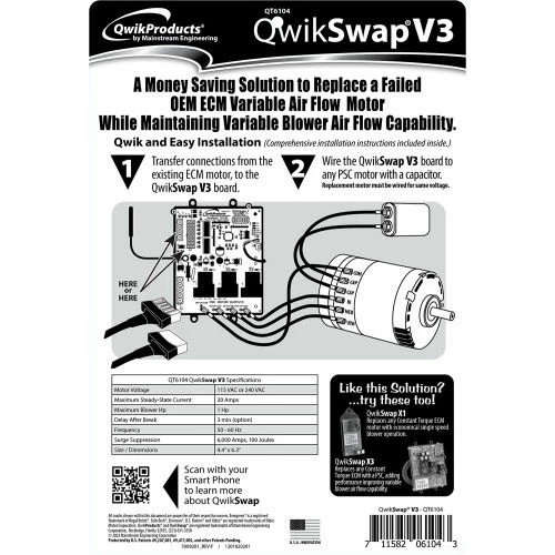 QwikSwapยฎ V3 (QT6104) provides replacement of a failed OEM Variable Air Flow Rate ECM 2.0. 2.3, 2.5 or 3.0 motor with a Permanent Split Capacitor (PSC) motor while maintaining variable blower air flow capability. As with any QwikSwap, installation simply requires moving wires from the failed ECM motor to the QwikSwapยฎ V3 board, then connecting the new PSC motor’s common and the three power leads (one for each speed) to the QwikSwapยฎ V3 board (along with a capacitor). Operates with any PSC motor up to 1 horsepower, either 120 or 240 VAC single phase.