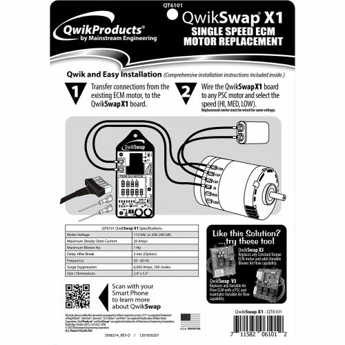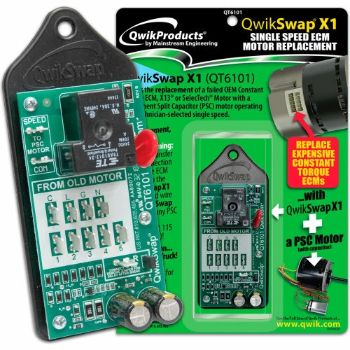 The basic QwikSwapยฎ X1 (QT6101) provides a single technician-selected motor speed when replacing a failed OEM Constant Torque ECM blower motor. Installation is as easy as moving wires from the failed ECM motor to the QwikSwapยฎ X1 board, then connecting the replacement PSC motor’s common and power lead to the QwikSwapยฎ X1 board (along with a capacitor). Operates with any PSC motor up to 1 horsepower, either 120 or 240 VAC single phase.
