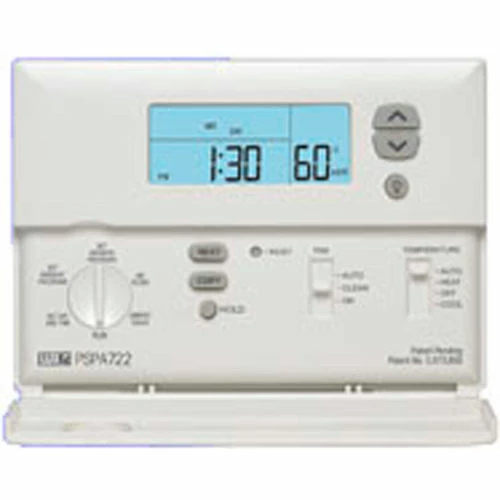 7 – day programmable digital 24V thermostat, temperature range 40° to 90°F (∓1°F differential). Up to 85 operating humidity range (%RH). Automatic changeover